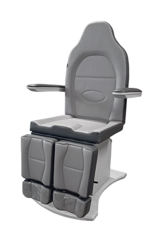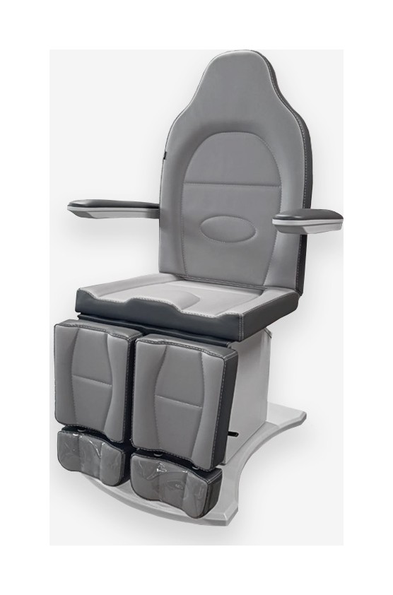 Педикюрное кресло оснащено тремя электромоторами, обеспечивающими регулировку высоты, угла наклона спинки и угла наклона сиденья. Опоры для ног фиксируются при помощи газ-лифтов. Кресло легко раскладывается в горизонтальное положение, образуя ровную поверхность. Надежная конструкция системы подъема обеспечивает высокую устойчивость кресла даже при максимальной высоте. Управляется при помощи ручного проводного пульта. Дополнительно при производстве могут быть установлены различные опции.