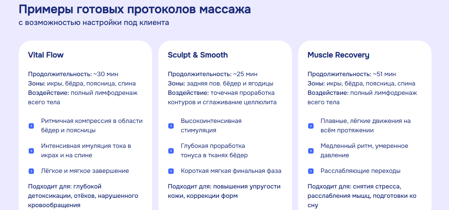 Обеспечивает удаленное обновление массажных протоколов, обновление версий устройства, постоянный мониторинг и поддержку.